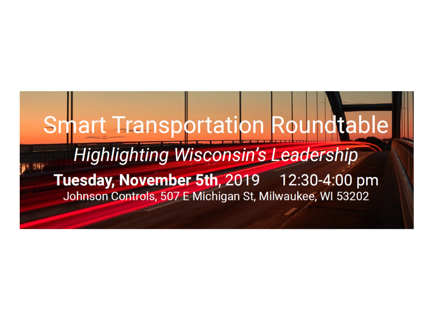 November 5, 2019, 12:30 p.m.-4 p.m. – Smart Transportation Roundtable, Johnson Controls Headquarters, 507 E. Michigan St., Milwaukee, Wisconsin